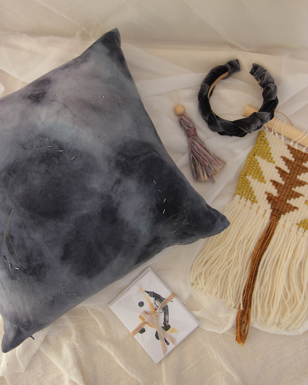 Examples of items include: original paintings, pillow covers*, wall hangings, holiday ornaments, stationery, and accessories.