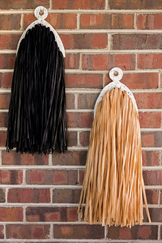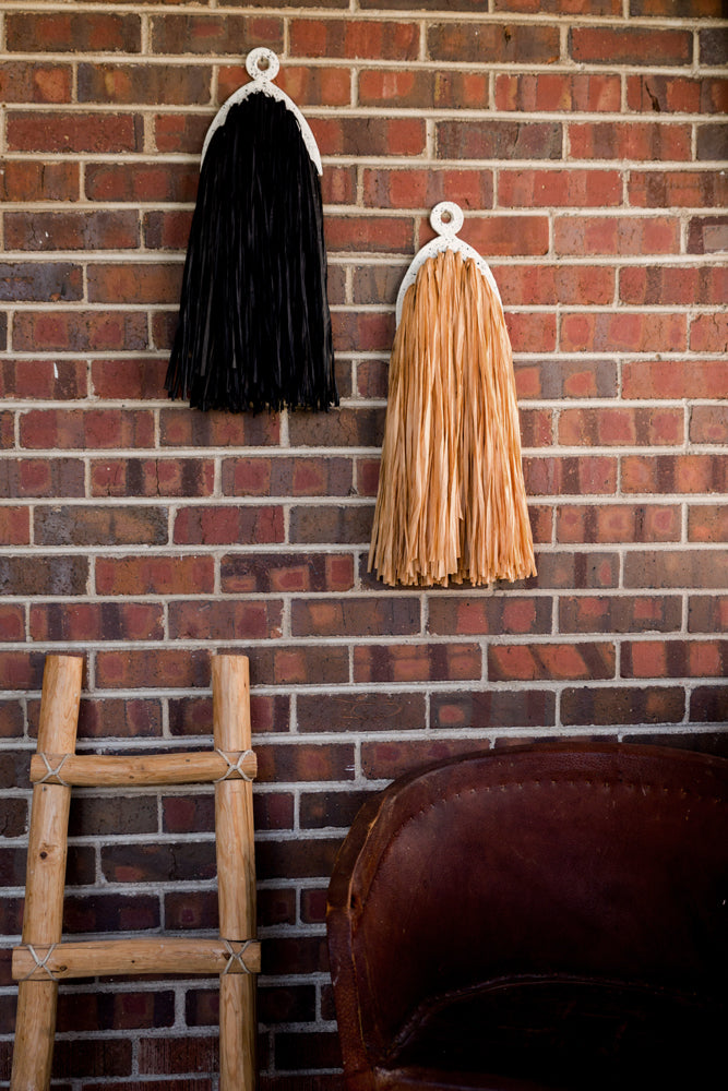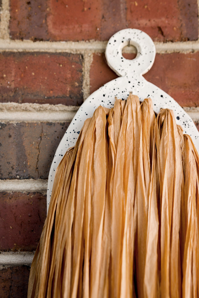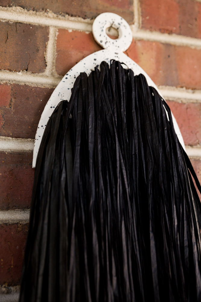"Rowan" is an original sculptural wall hanging using hand painted polymer clay and raffia. The contrasting textures of the clay and paper fringe create interest and subtle movement. The use of polymer clay instead of ceramic allows for a lighter weight piece that can be installed without additional hardware.