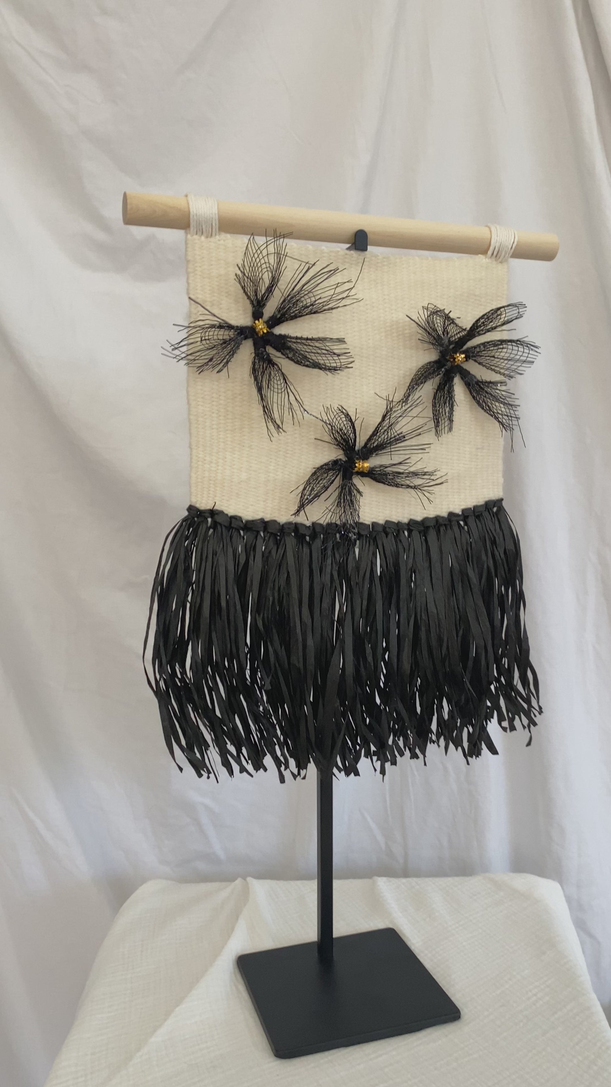"Sylvie" is an original weaving using natural wool, raffia, and sculptural floral appliqués. The weaving is woven entirely by hand and then hand embellished. The floral elements were created with mesh and gold beading. The weaving is sewn onto a wooden dowel with hanging hardware attached.