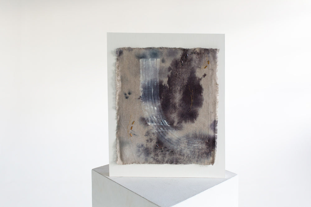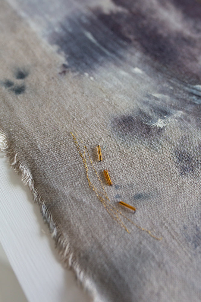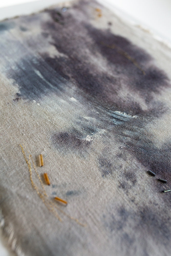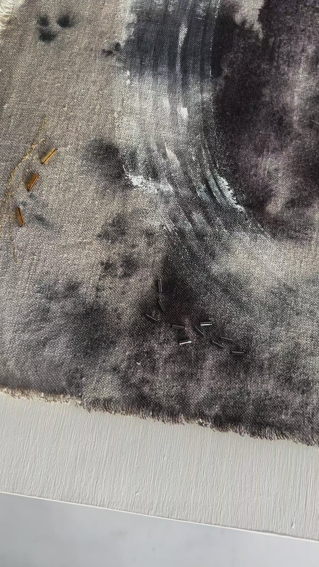 "The Faint of Heart" is an original abstract mixed media painting comprised of liquid dye, oil paint, acrylic paint, gold embroidery, and beading on linen that has been mounted to birch canvas.
